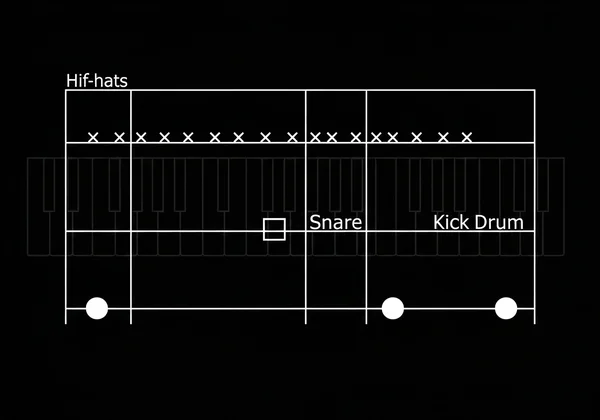 同時引入「鬼音」技巧—主拍間的微弱小鼓點擊。在鍵盤上透過輕觸小鼓鍵模擬,能為節奏增添細膩律動紋理。練習基本搖滾節奏時,可在計數的「e」與「a」處加入輕柔鬼音。